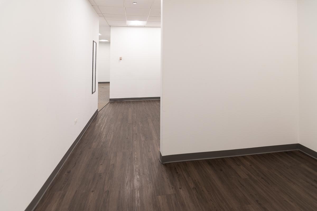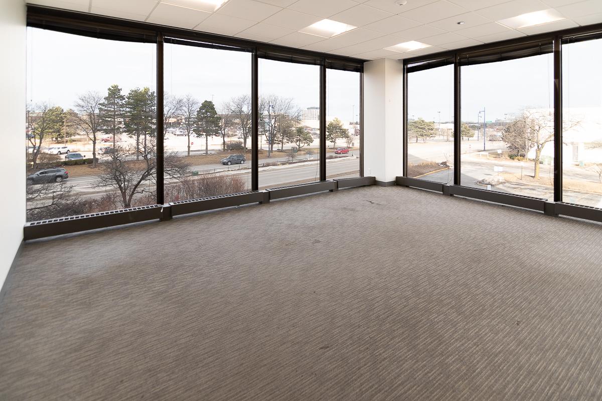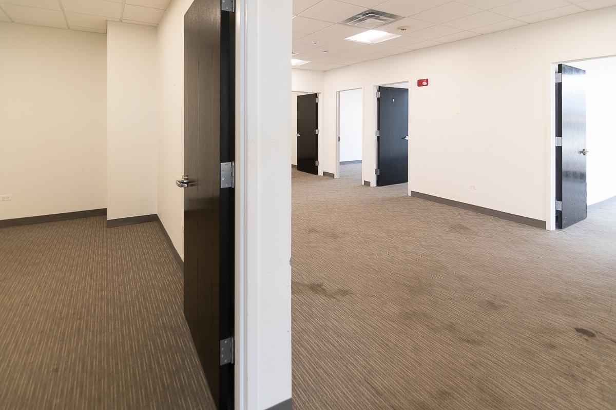 A corner suite features five window line offices, two interior offices, a kitchen, a storage closet, and an open area for reception.
