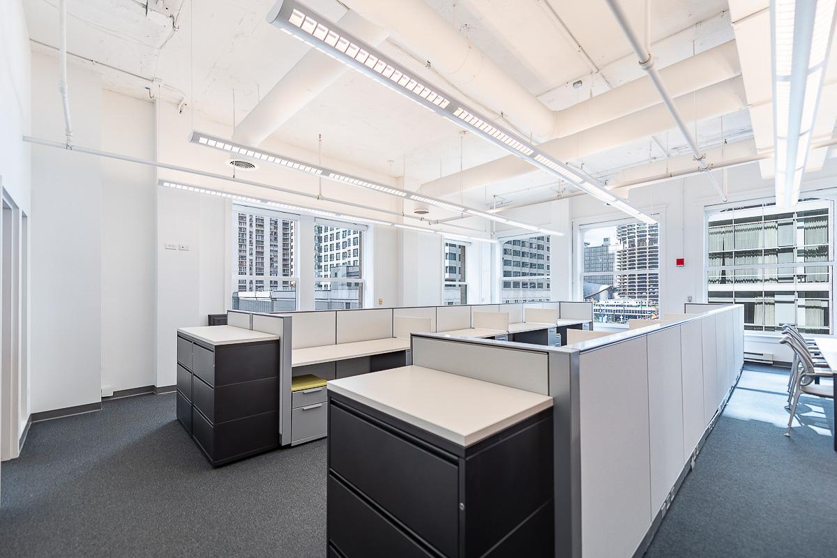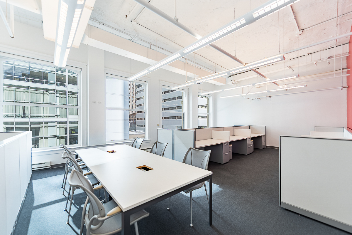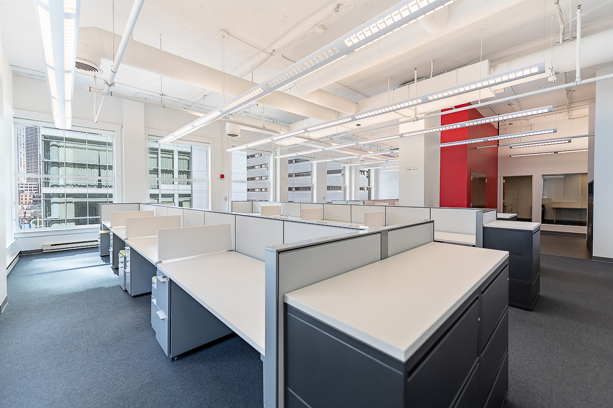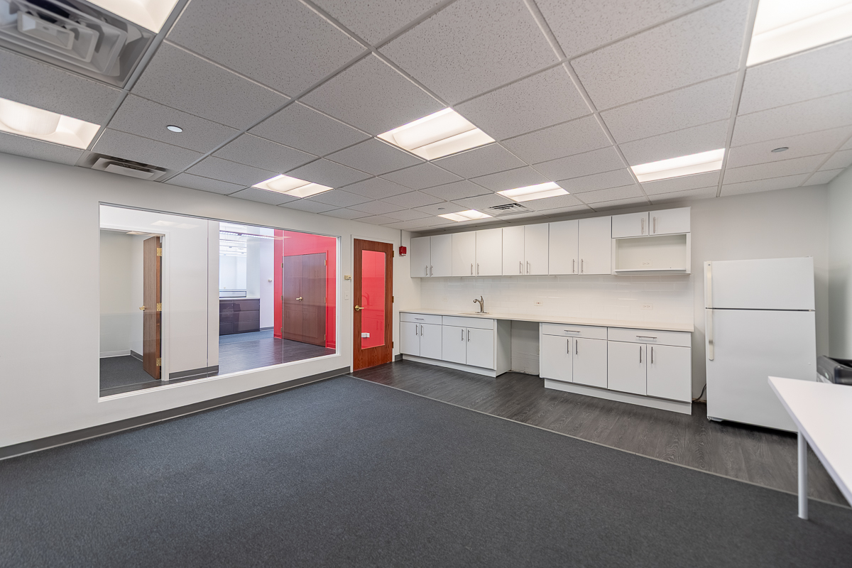 Suite 404 features a well-planned layout featuring five (5) private offices, a large kitchen, two (2) restrooms, and a spacious open workspace ideal for collaboration.