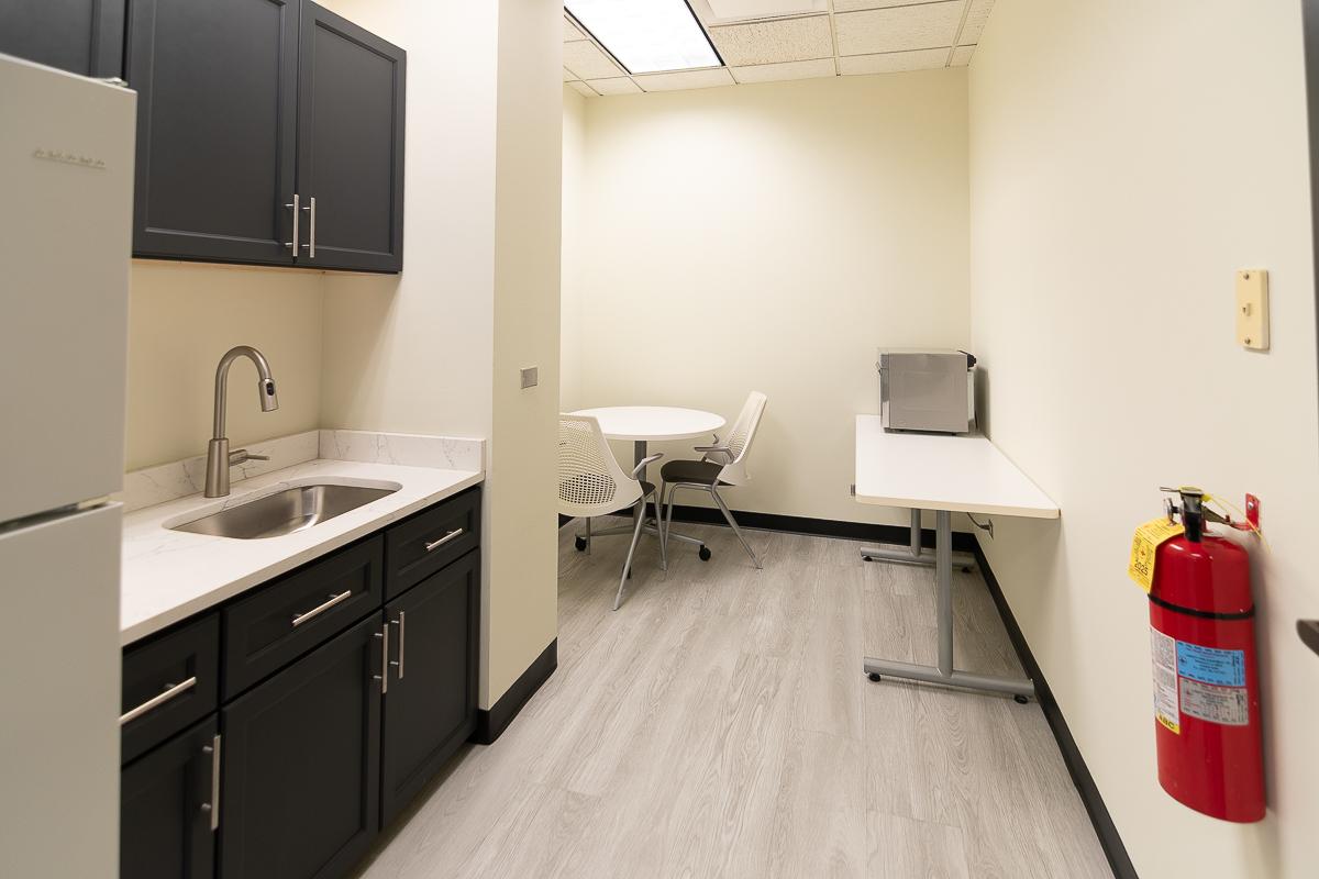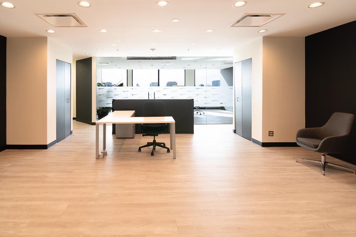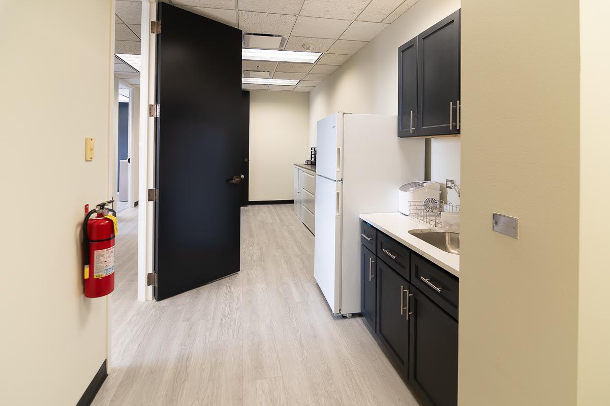 The suite includes two entrances, seven windowed offices, a conference room, a reception area, a kitchen, an IT closet, and an open work area.