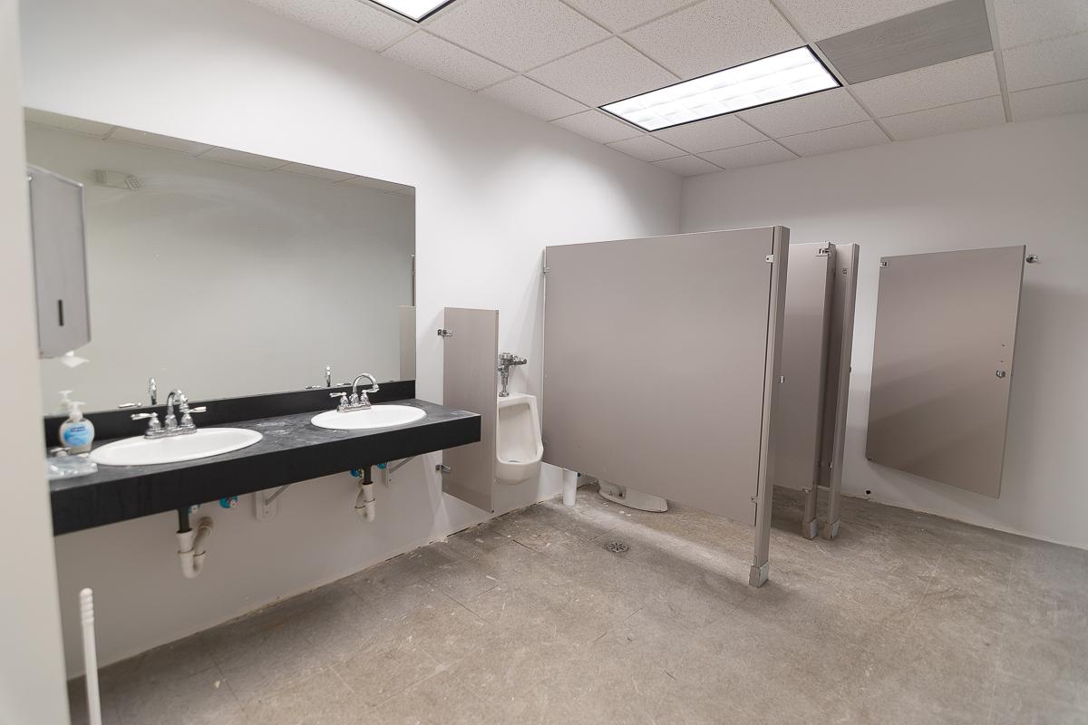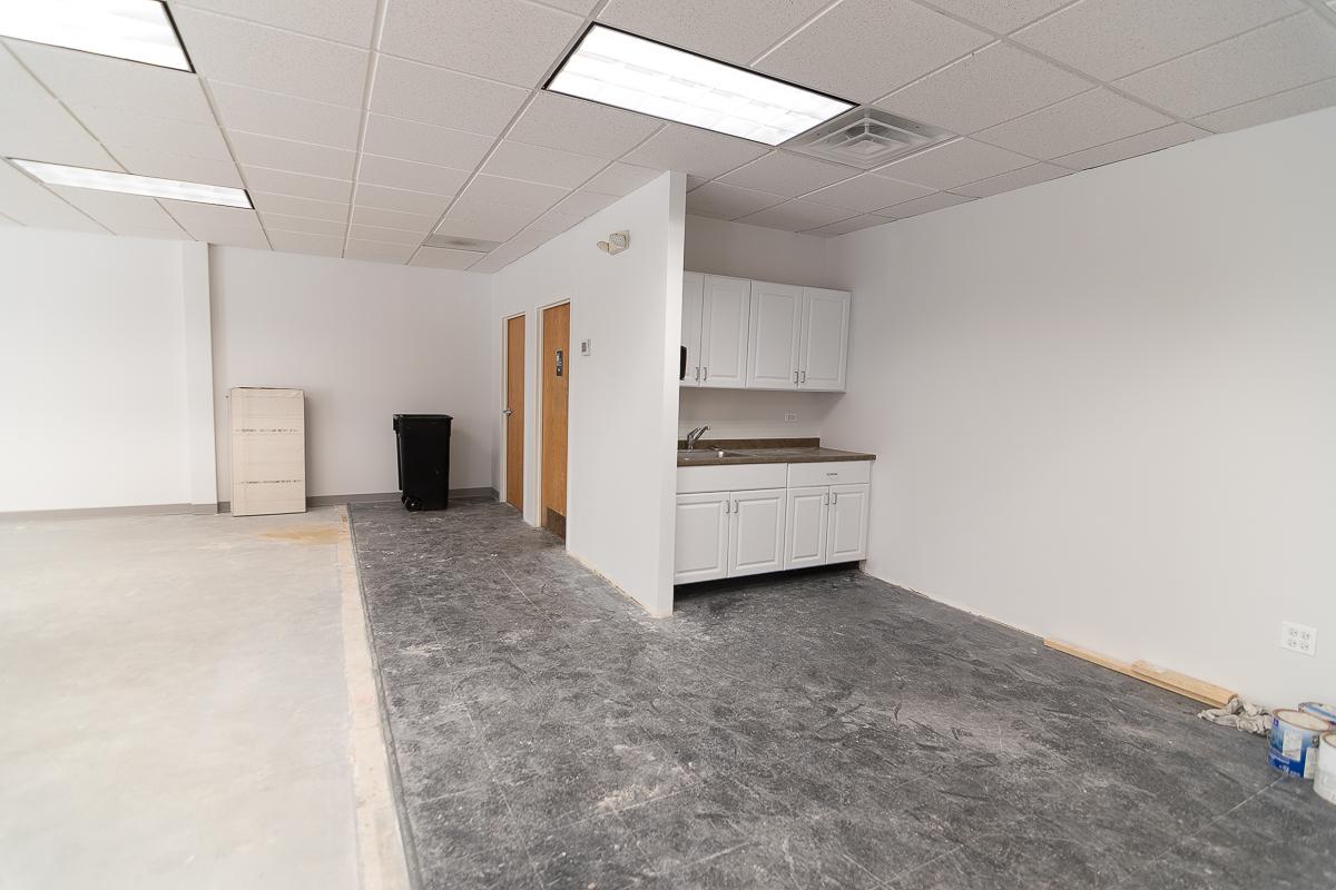 Suite has a large open work area, a kitchenette, and a bathroom.