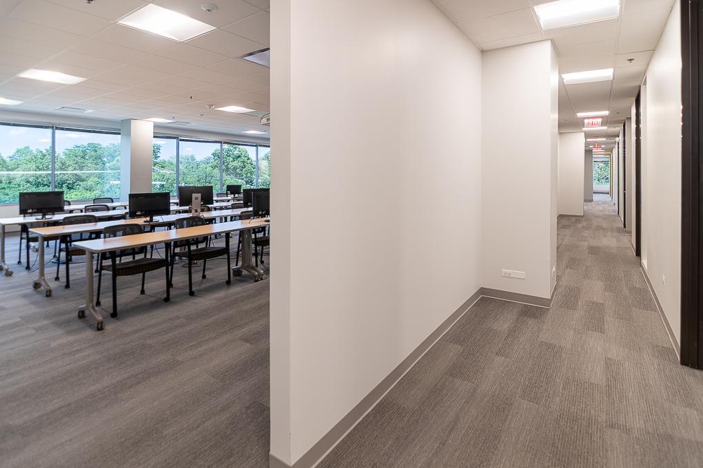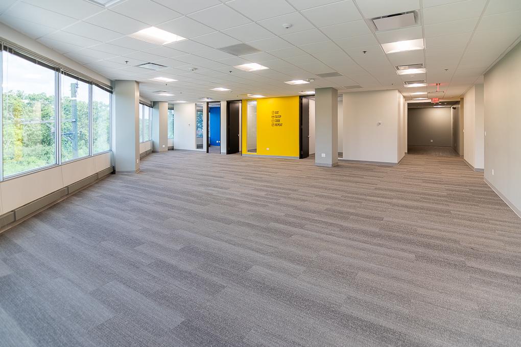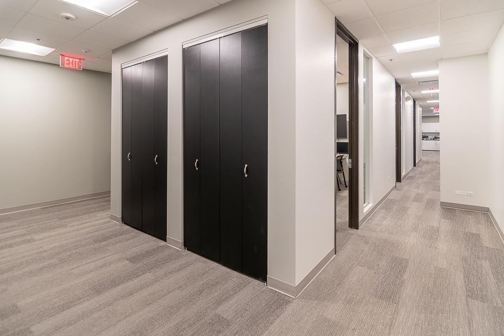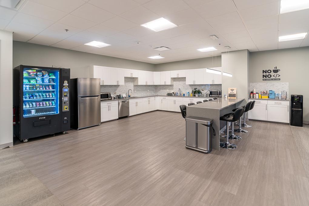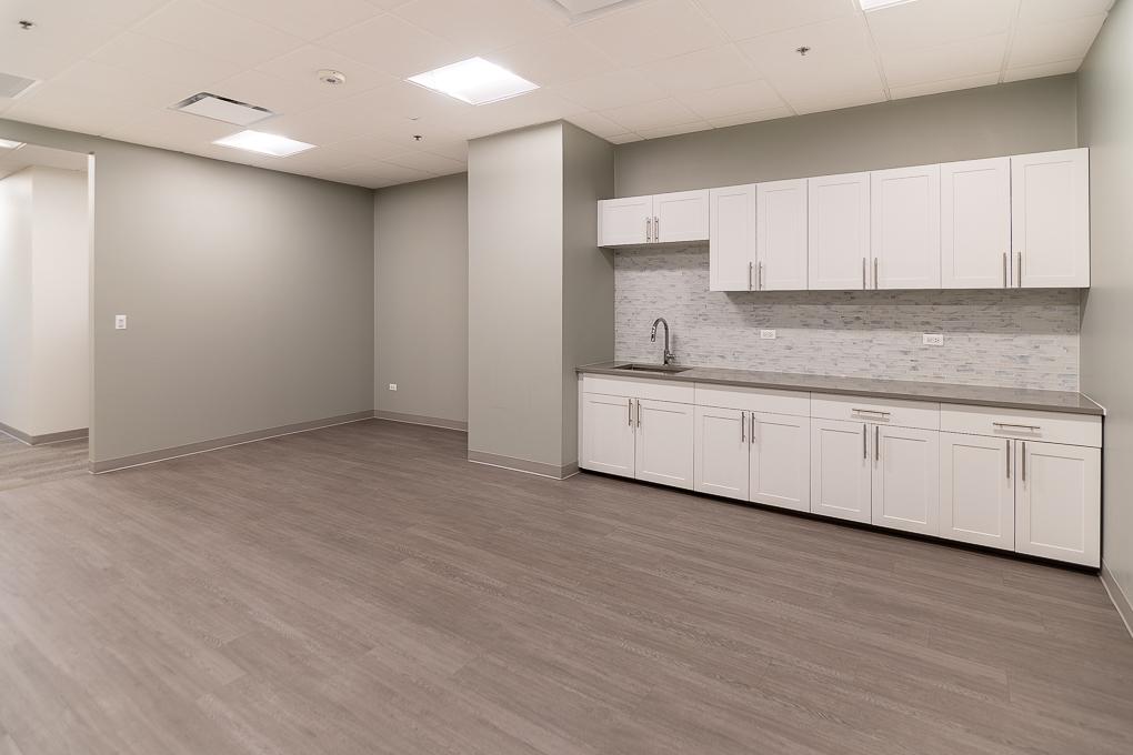 Suite features three entrances, twelve private offices, two seminar rooms, two collaborative areas, two kitchens, and two storage/IT closets.