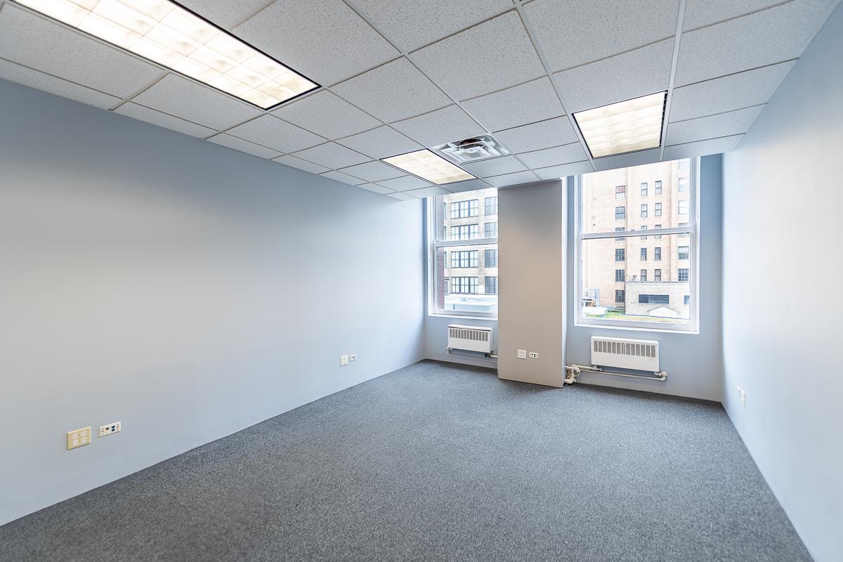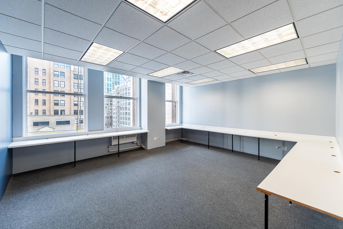 Discover a vibrant workspace in downtown Chicago’s Loop. Suite 1507 features an open concept with ample natural light and calming blue and green walls. With 1,455 sq ft, it includes two private offices and a conference room for collaboration. An integrated kitchenette adds convenience, and it’s close to public transport and parking.
