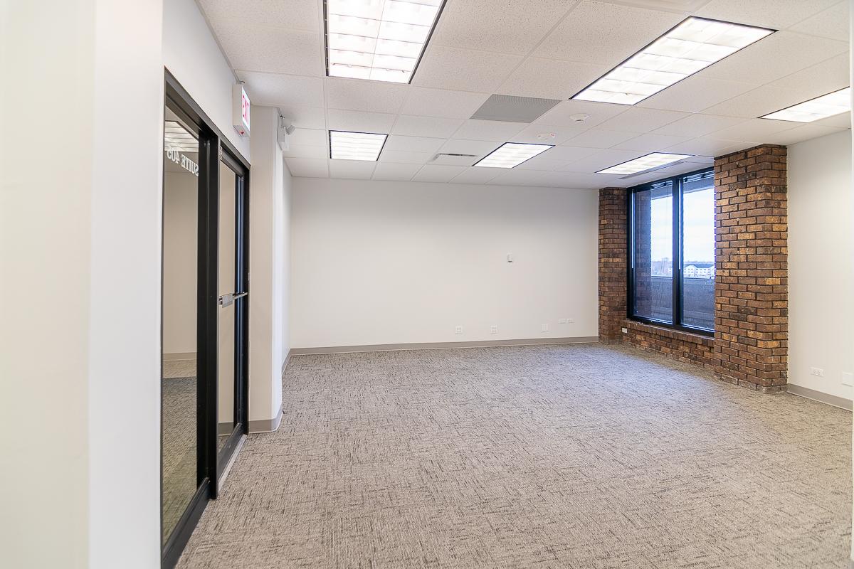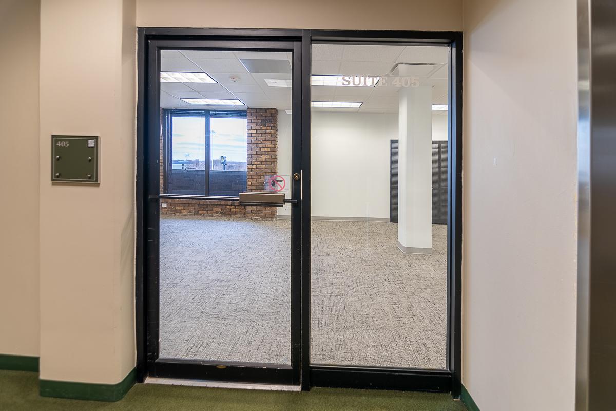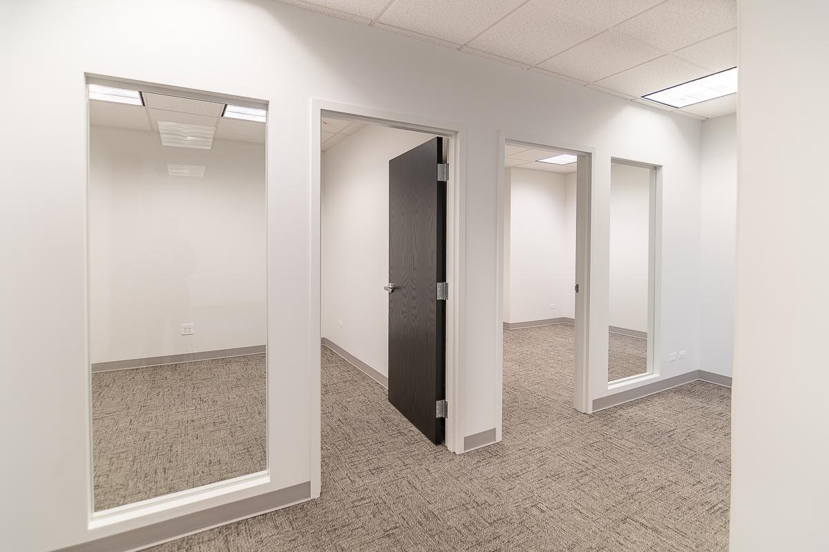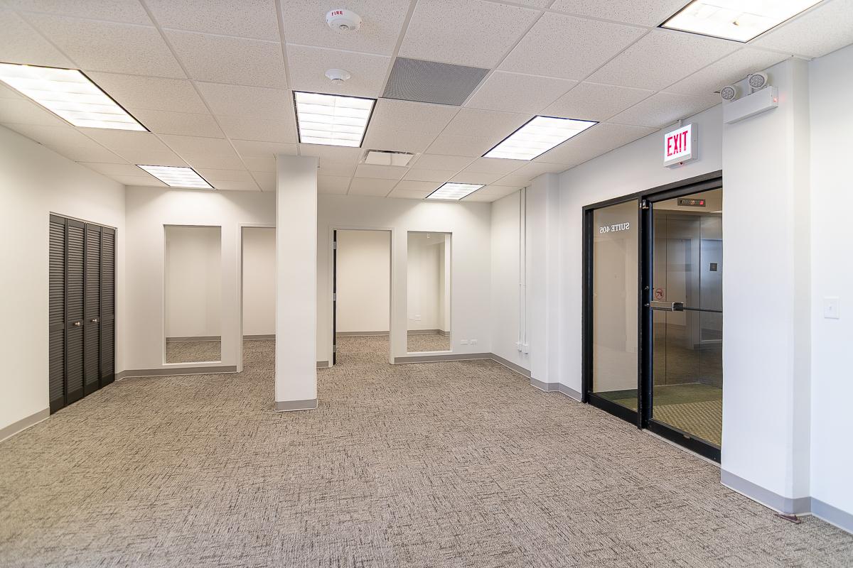 Suite has two offices, an open area for workstations, and a closet.