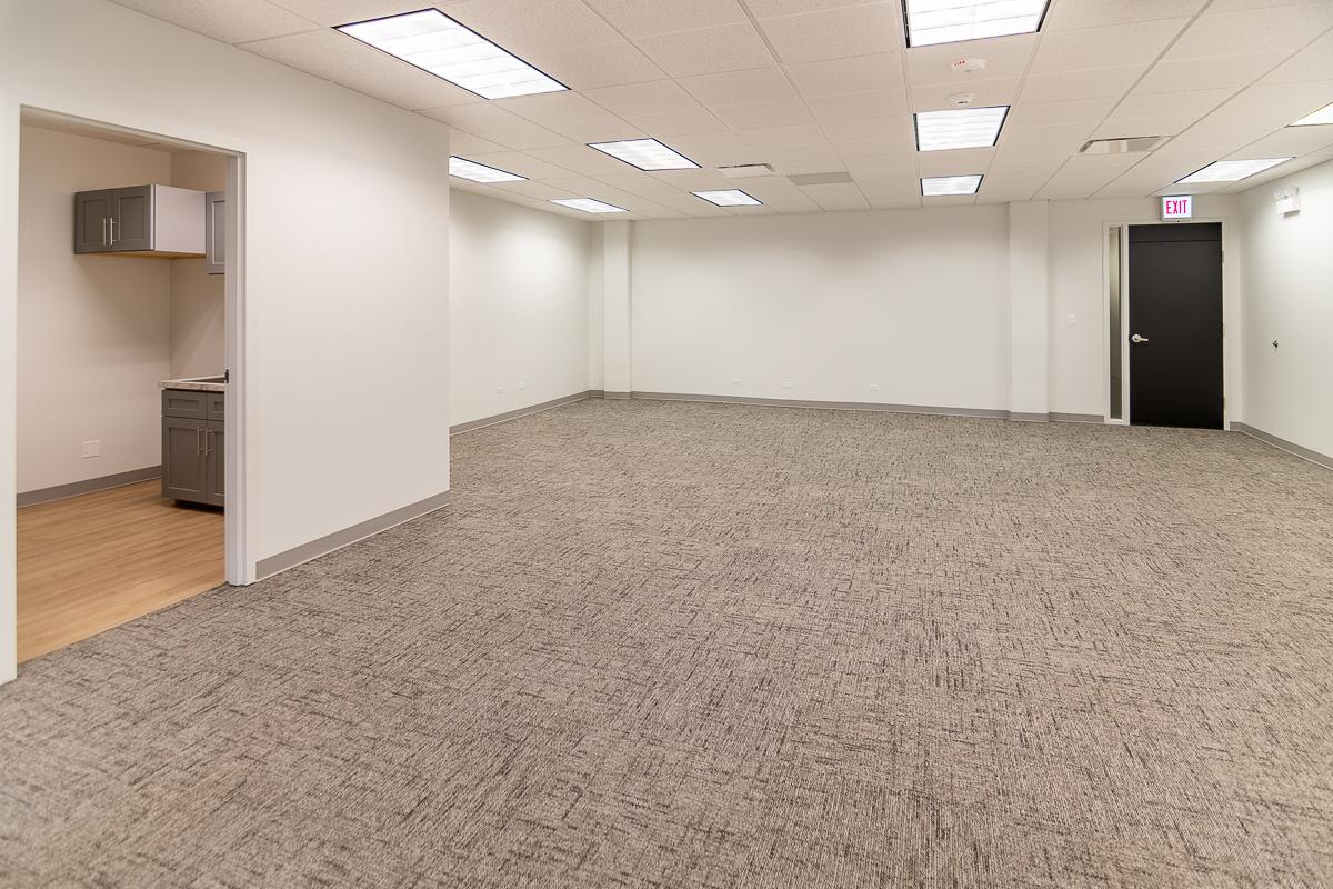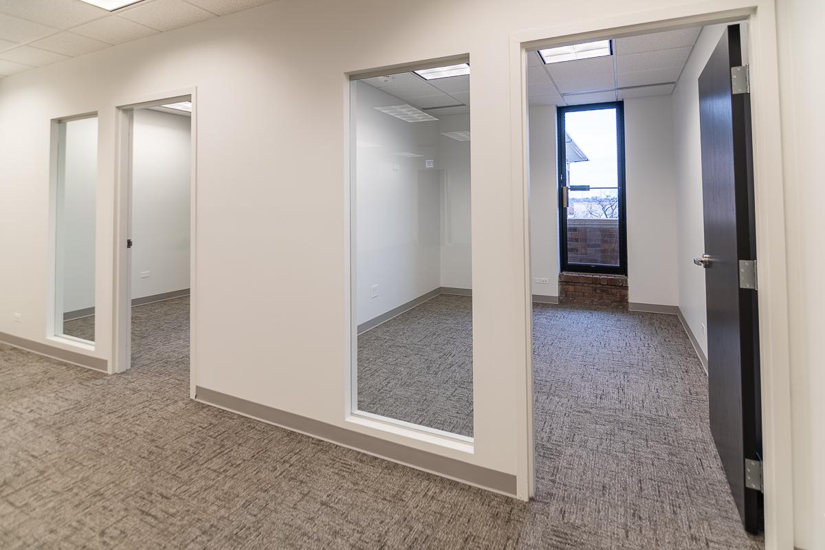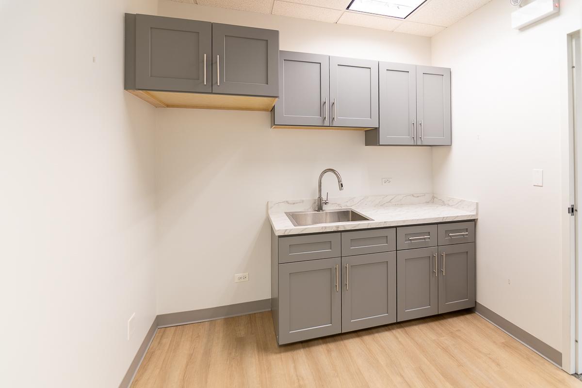 Suite has three offices, a closet, a sink, and an open area for workstations/desks.