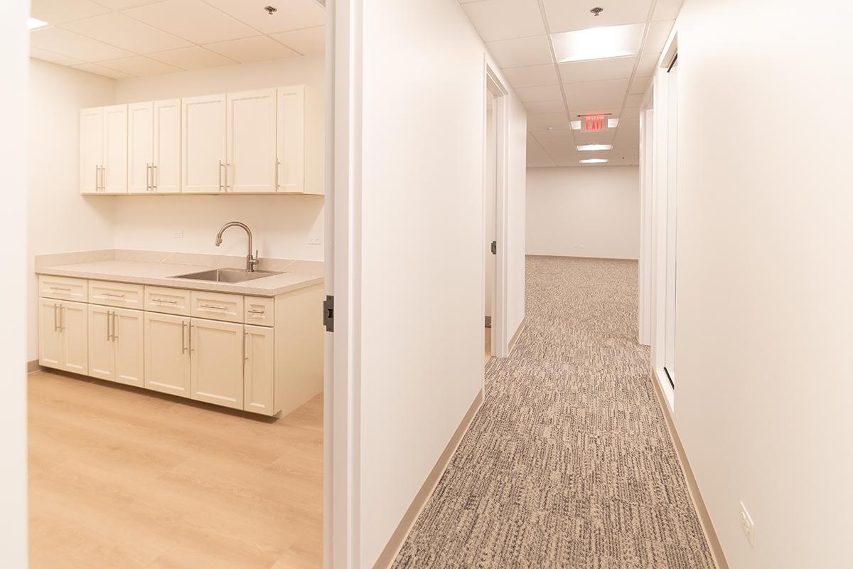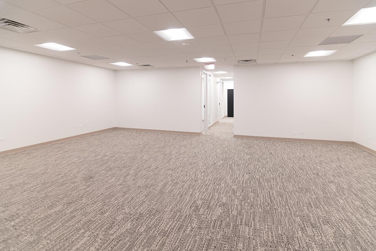 Newly remodeled suite features two offices with windows, one interior office, IT/storage room, and open work area.